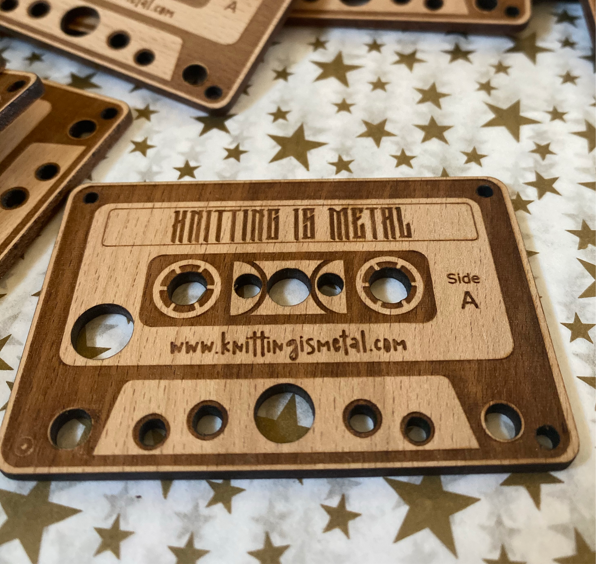 Wooden knitting needle gauge shaped like your favorite metal mix tape!