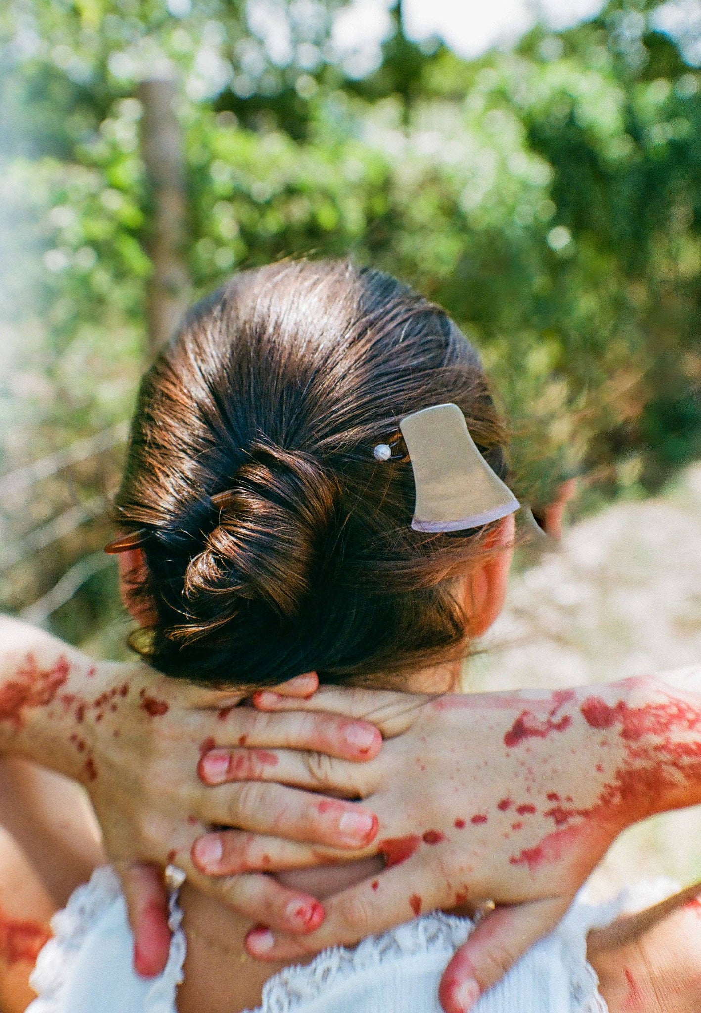 Inspired by the axe-wielding, scarecrow loving, alligator feeding, line dancing A24 star Pearl, the Axe Hair Stick is a lightweight hair accessory to pull your hair back on the farm or anywhere else. Can double as a shawl pin!
